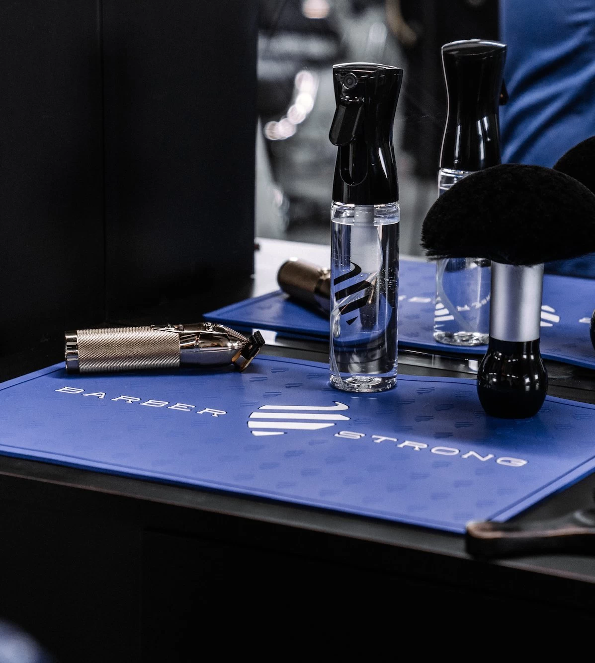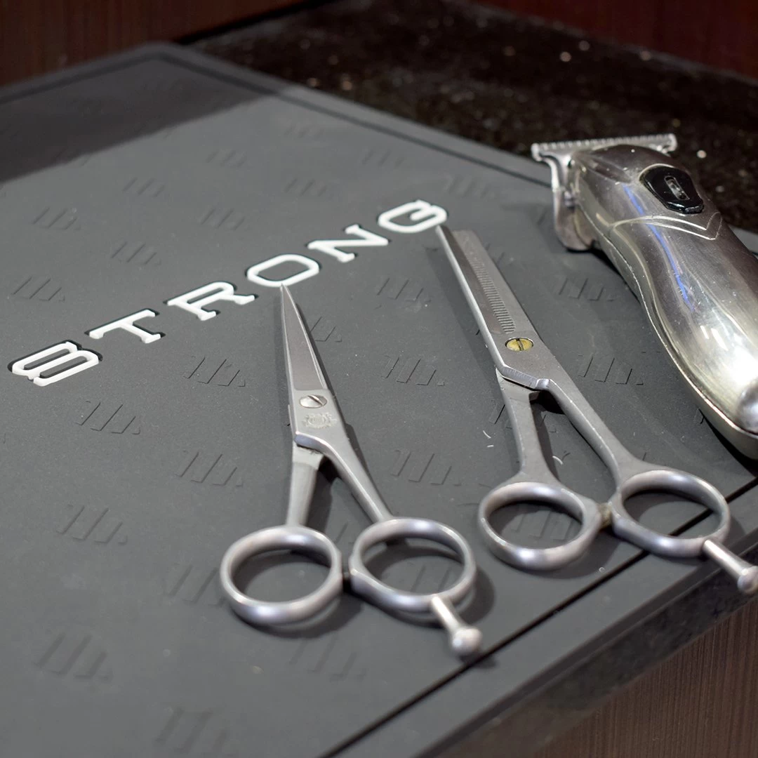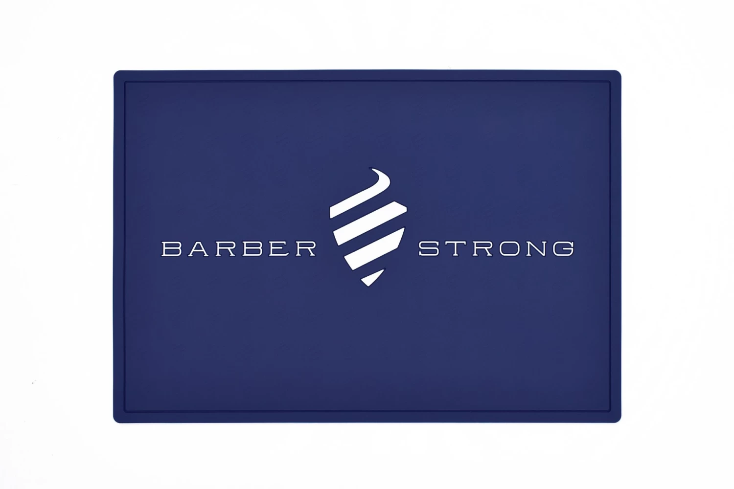 The Barber Strong logo, staggered and raised slightly throughout the Mat, provides extra grip and helps prevent tools from sliding off the station onto the floor.