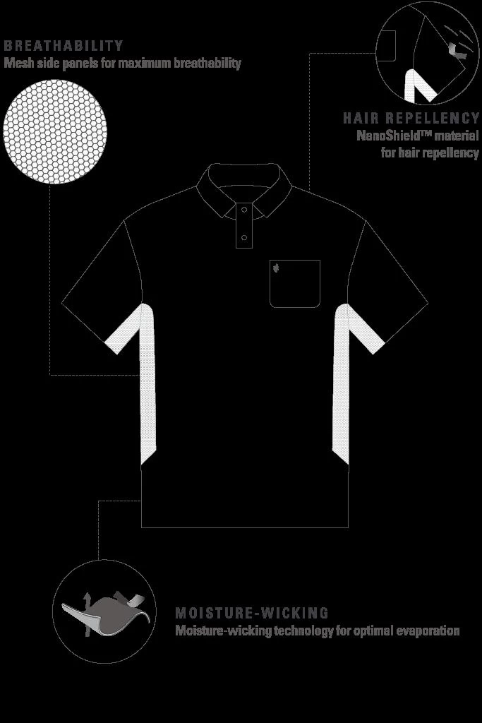 The Barber Polo features moisture-wicking material and mesh side panels, keeping you cool and dry in the shop. Comfort fit allows for natural range of motion.