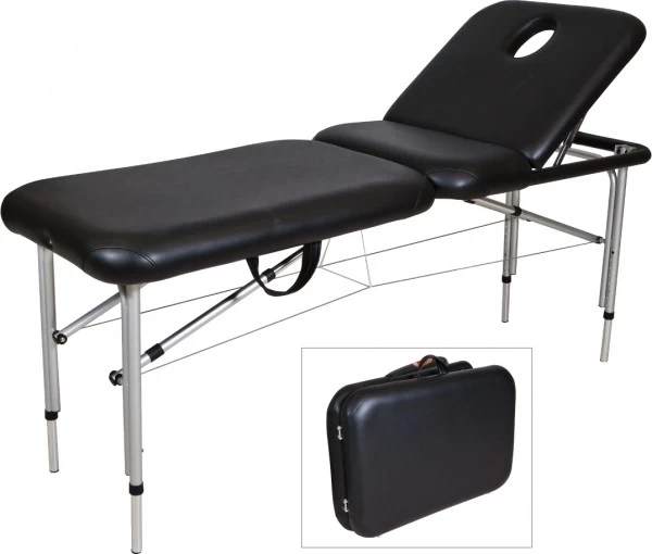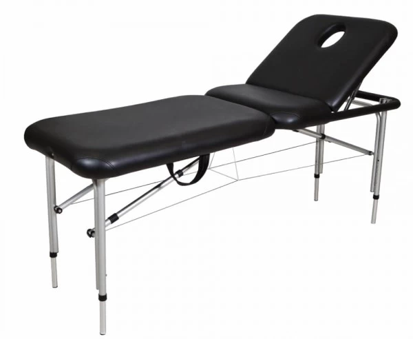 Lightweight Black Aluminium bed with adjustable legs.