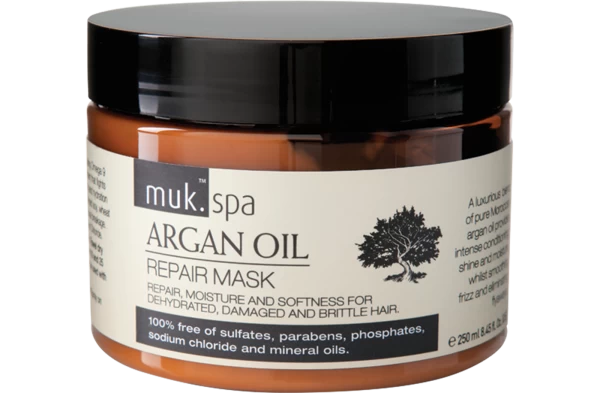 Containing a luxurious blend of pure Moroccan Oil, muk Spa Argan Oil Repair Mask, aids in the repair of dehydrated, damaged and brittle hair, adding moisture and shine. DOES NOT CONTAIN Sulfates, Parabens, Phosphates, Sodium Chloride or Mineral Oils.