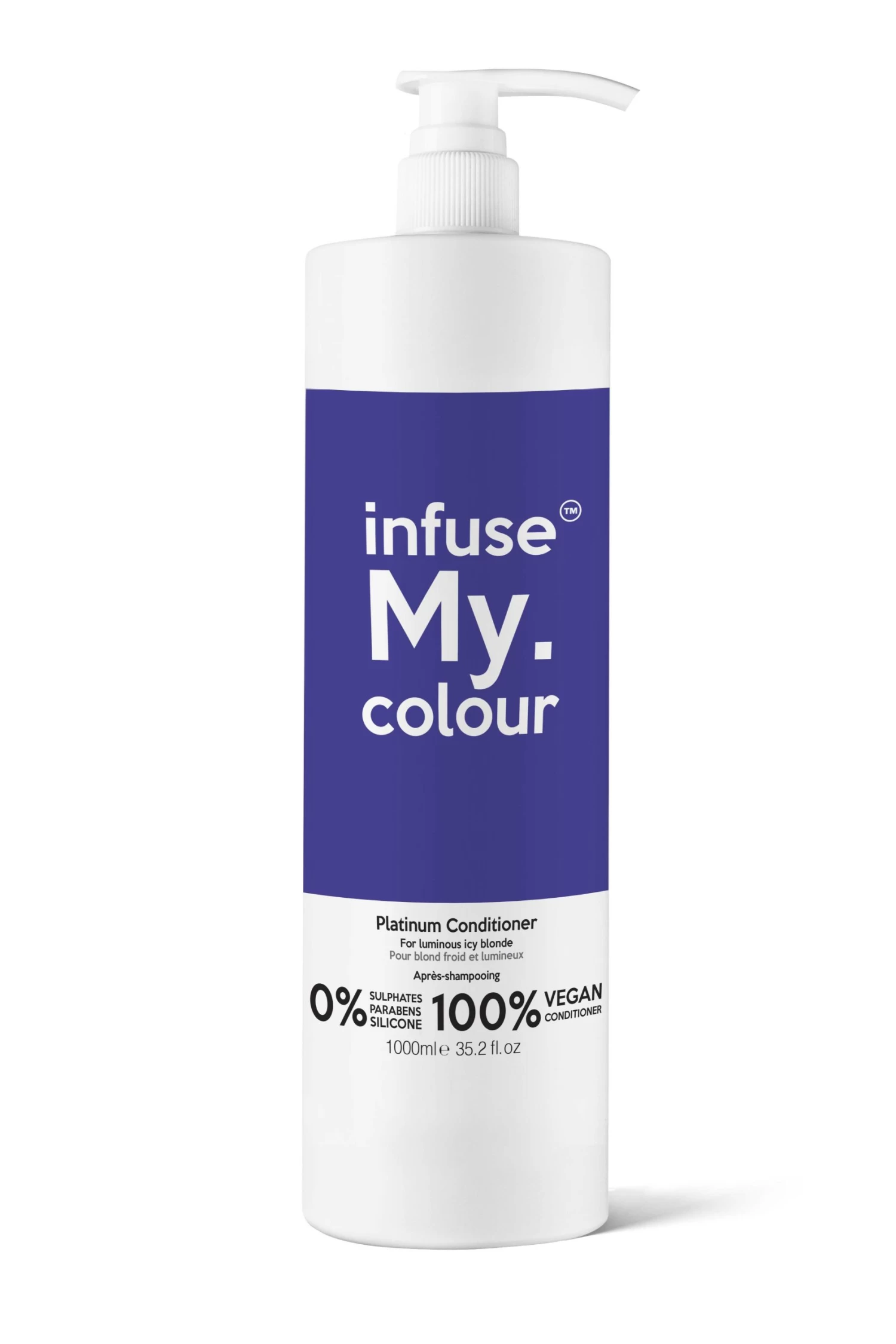 Infuse My Colour Conditioner Platinum maintains yellow/gold in bleached hair. Maintains the brightness of grey and white hair. Great on highlights for a cool tone. Platinum delivers icy blonde clean effects.
