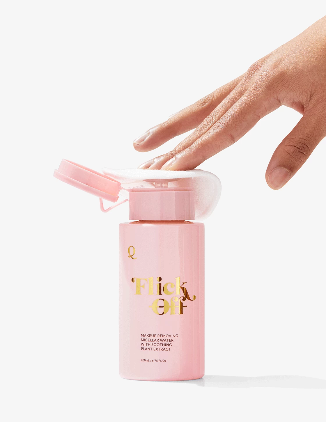 HOW TO USE: Using Flick Off! Reusable Makeup Remover Pads (or another cotton pad of your choice) press top of dispenser and pump down to saturate. Sweep pad across areas you wish to remove makeup. Once all makeup is removed, apply a second layer of solution before washing off with cold water.
